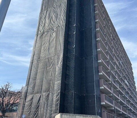 小野田市にて、外壁塗装工事のための足場を350㎡設置いたしました。建物全体を囲う形で足場を組み、飛散防止