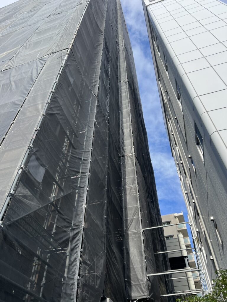 大規模建物の外装改修に伴い、延べ5,776㎡の足場仮設工事を行いました。安全性と施工性を両立した足場計画で、周辺環境への配慮を徹底しながら施工しています。