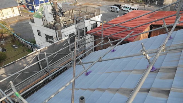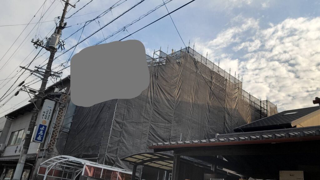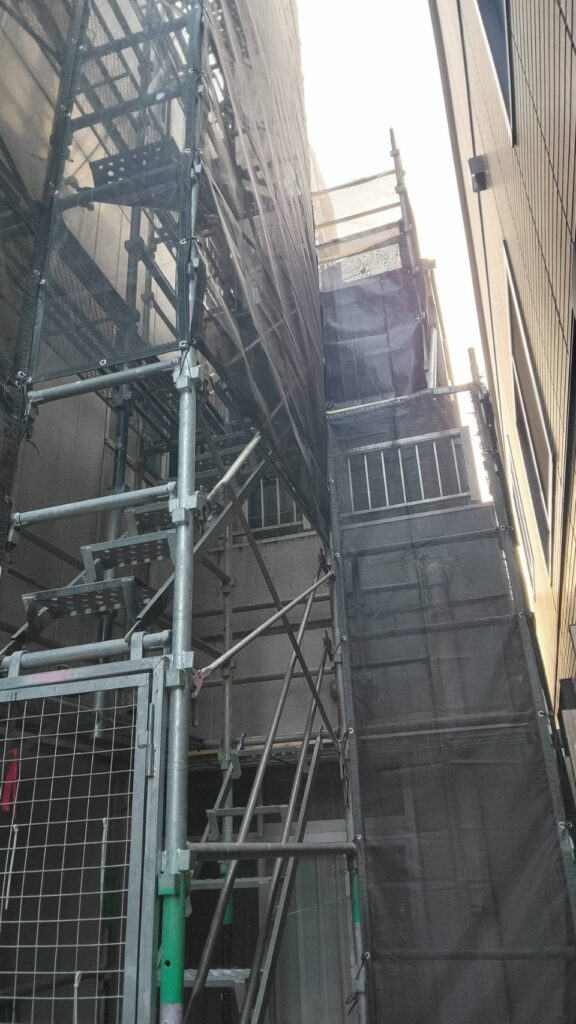 安全性と作業効率を重視し、建物全体をしっかりと覆う形で組み上げています。近隣への配慮を徹底しながら、職人が安心して作業できる環境を整備しました。