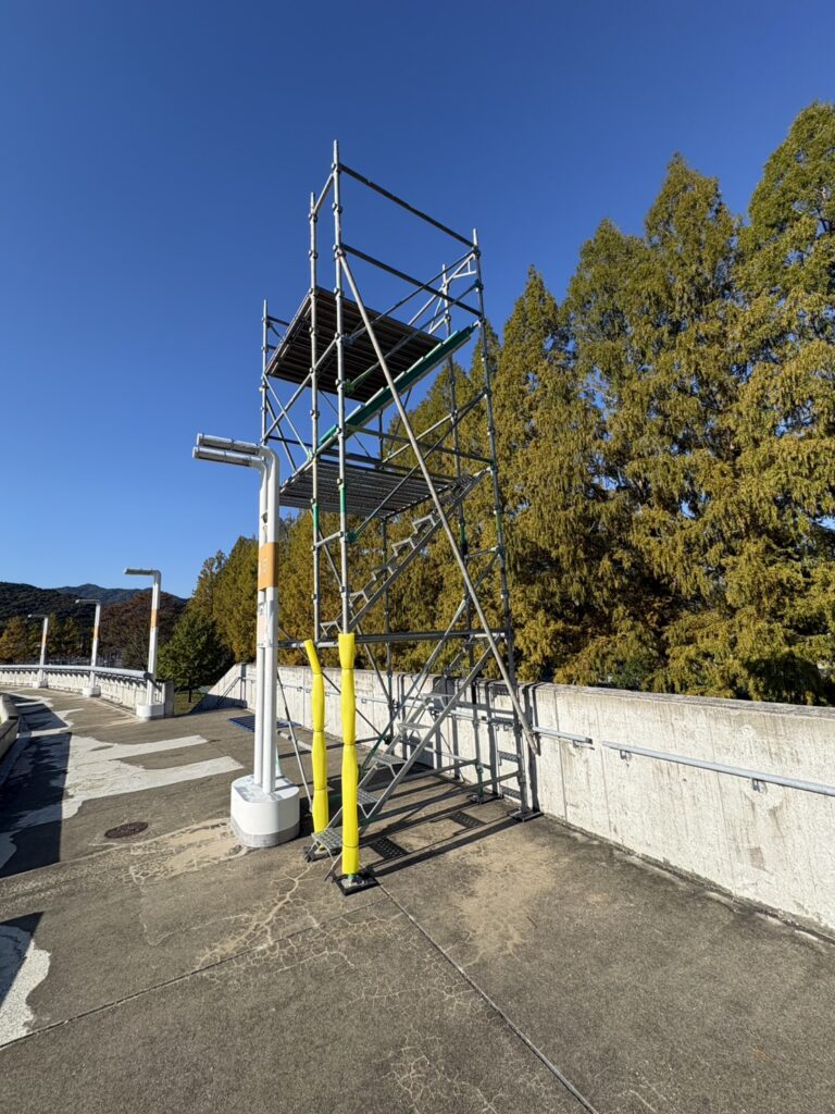 山口市にて、テレビ中継カメラ設置のための専用足場を施工しました。周囲の環境や機材配置を考慮し、揺れを最小限に抑える安定性の高い構造で組み上げています。