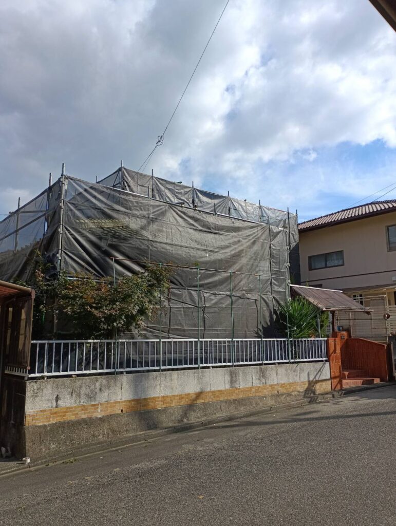 周南市にて、住宅外壁塗装のための足場を176㎡規模で設置いたしました。建物をしっかりと覆うメッシュシートを使用し、周辺への飛散防止と作業の安全性を確保しています。
