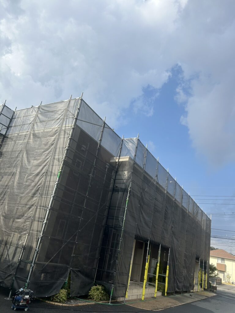 下松市にて、外壁塗装工事に伴う500㎡規模の足場仮設工事を行いました。建物全体をしっかりと覆うメッシュシートを使用し、塗料の飛散防止と安全性を確保。居住されている方々の動線を妨げないよう、出入口周りには十分なスペースと養生を施し、安全第一で施工を進めています。