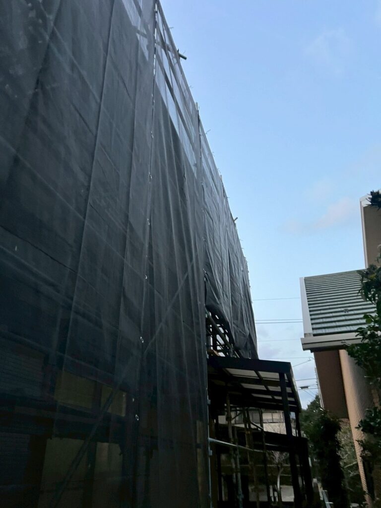住宅全体を囲う形で足場を設置し、作業性と安全性を最優先に計画。職人さんが安心して作業できるよう、十分な作業スペースを確保し、飛散防止対策も徹底しました。